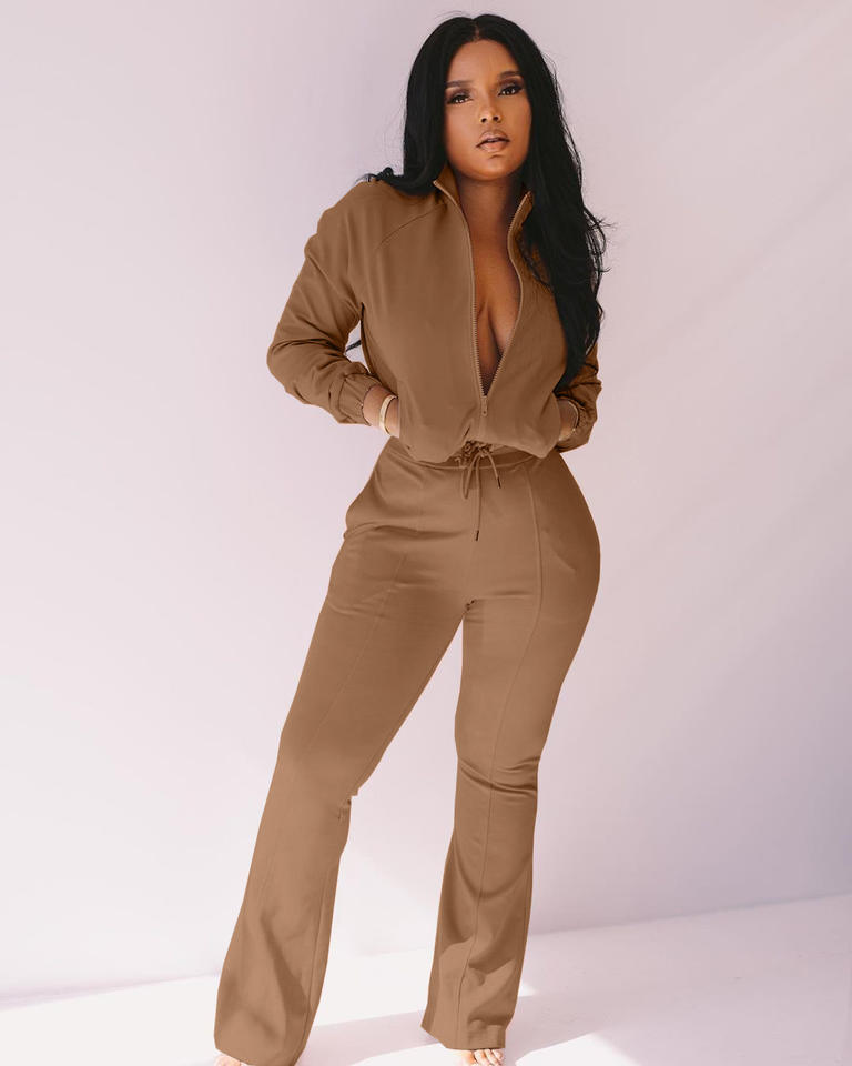 2025 New Women's Casual Sports Tracksuit Set Solid Color Knitting Fabric Stand Collar Autumn Clothing