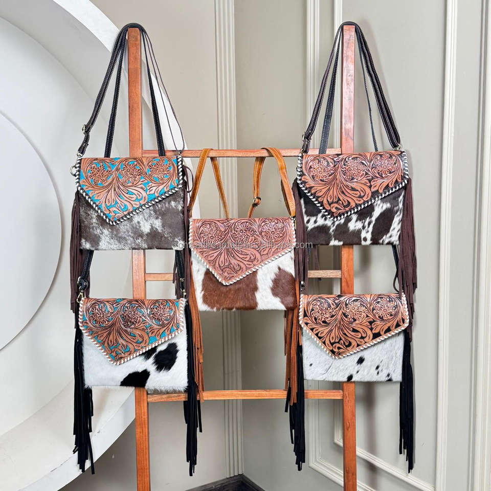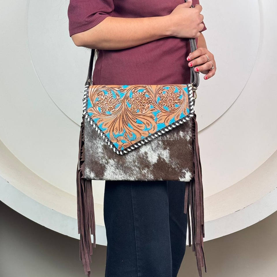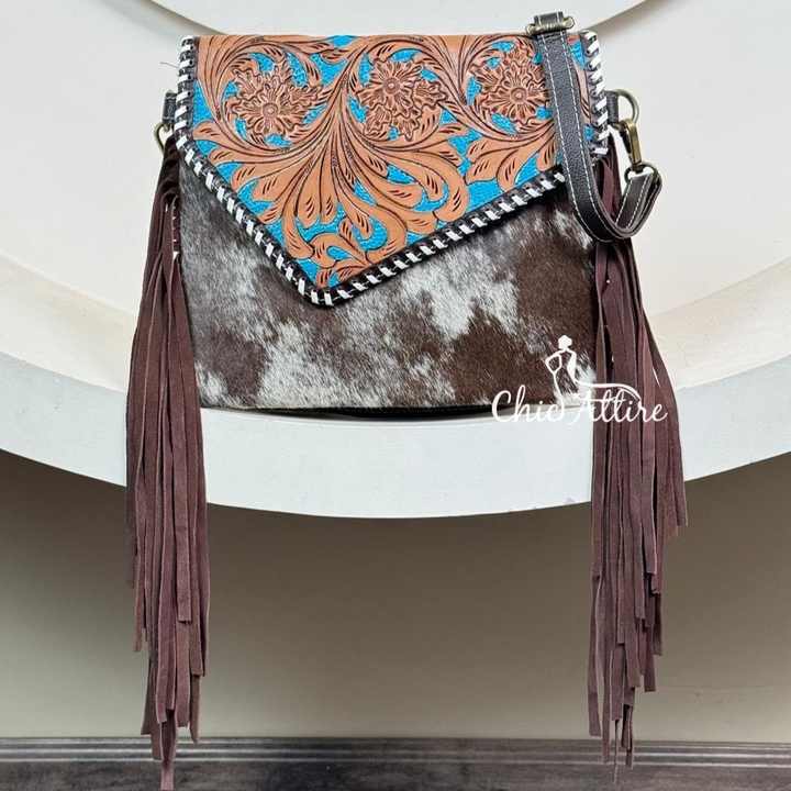 Hand Tooled Cowhide Leather Fringe Crossbody Bag