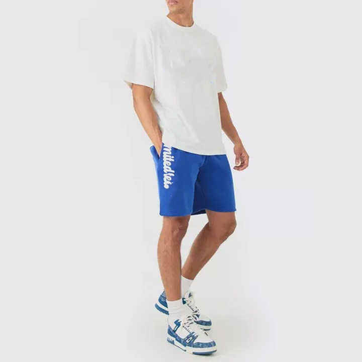 2025 Newest Design Tracksuit 100% Cotton Acid Wash Drop Shoulder White T-Shirt and Blue Shorts Puff Printing Logo Twin Set