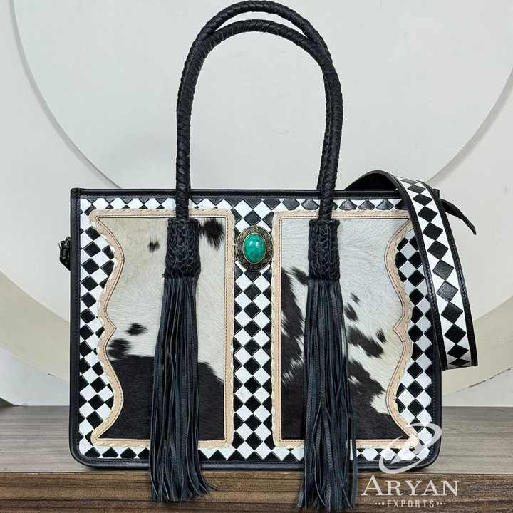 Hand Tooled Turquoise Stone Checkered Leather Tote Bags