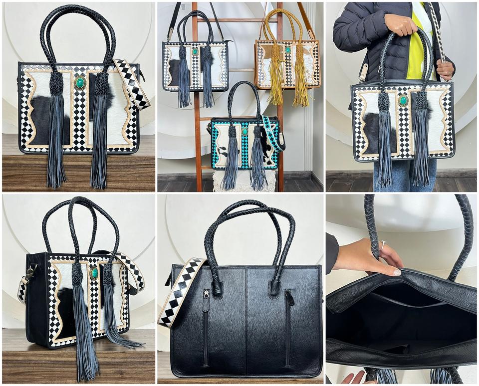 Hand Tooled Turquoise Stone Checkered Leather Tote Bags