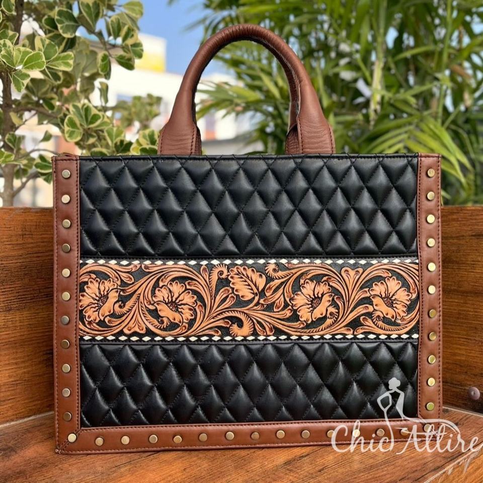 Hand Tooled Quilted Leather Tote Bag
