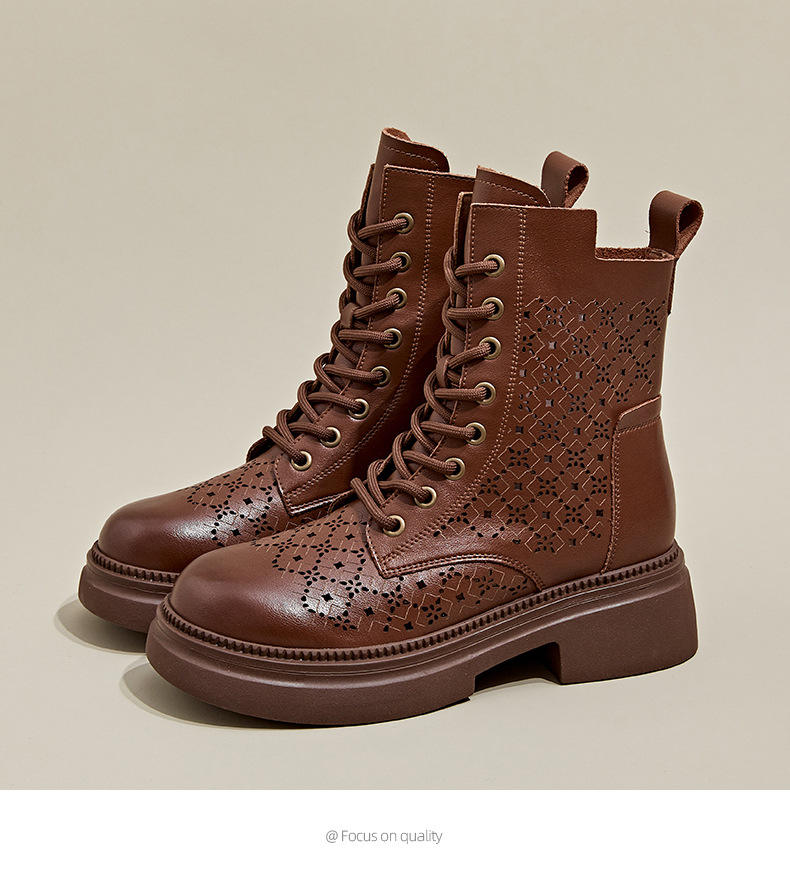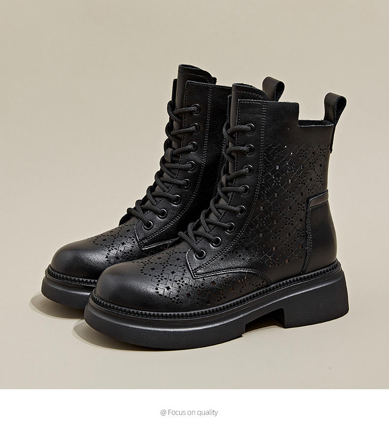 2025 Spring New Style Small Size Women's Shoes Hollow Out Martin Boots Thick Sole Wedge Heel Lace-up Leather Boots