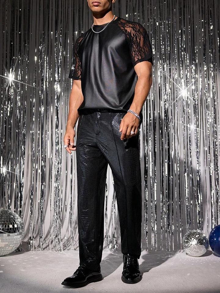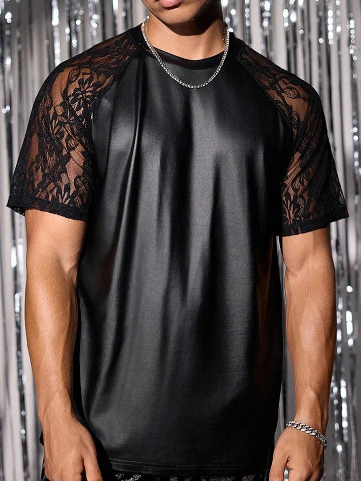 2025 Spring Summer Men's T-Shirt Stylish Patchwork Florals Embroidery Leather Sexy Mesh Short Sleeve Tops 100% Cotton Breathable