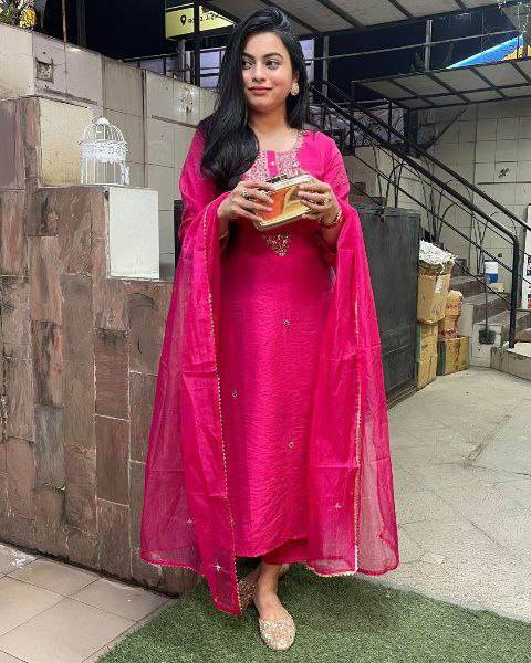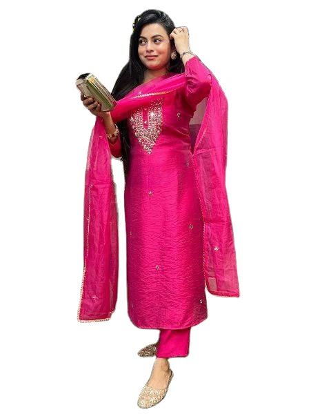 2025 Styles 1 Color Beautiful Embroidery Viscose Chanderi Silk Fabric Light Weight Knee Length Kurti& Bottom With Dupatta Set