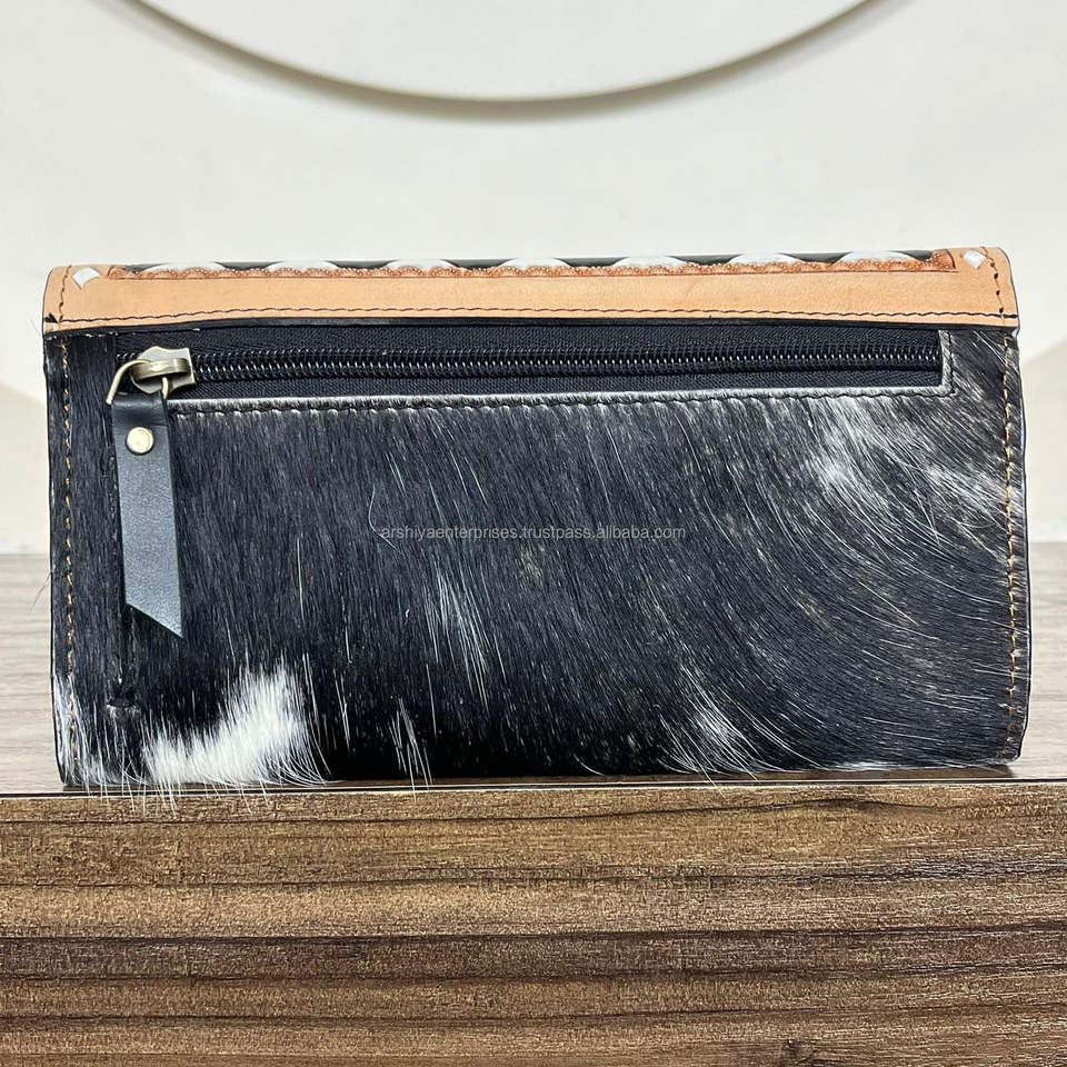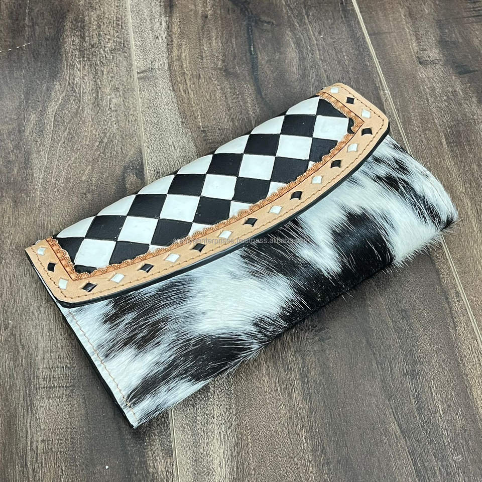 2025 Stylish Bohemian Black & White Checkered Style Hand Tooled Cowhide Leather Women's Unique Genuine Cowhide Clutch & Purses