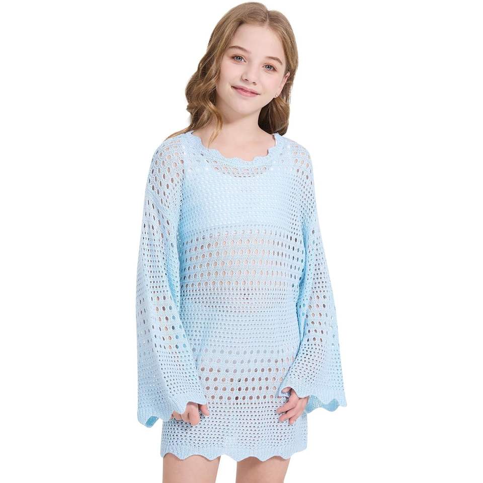 2025 Summer Beach Dress Girls Crochet Long Sleeve Swimwear Cover up Elegant Sunsuit