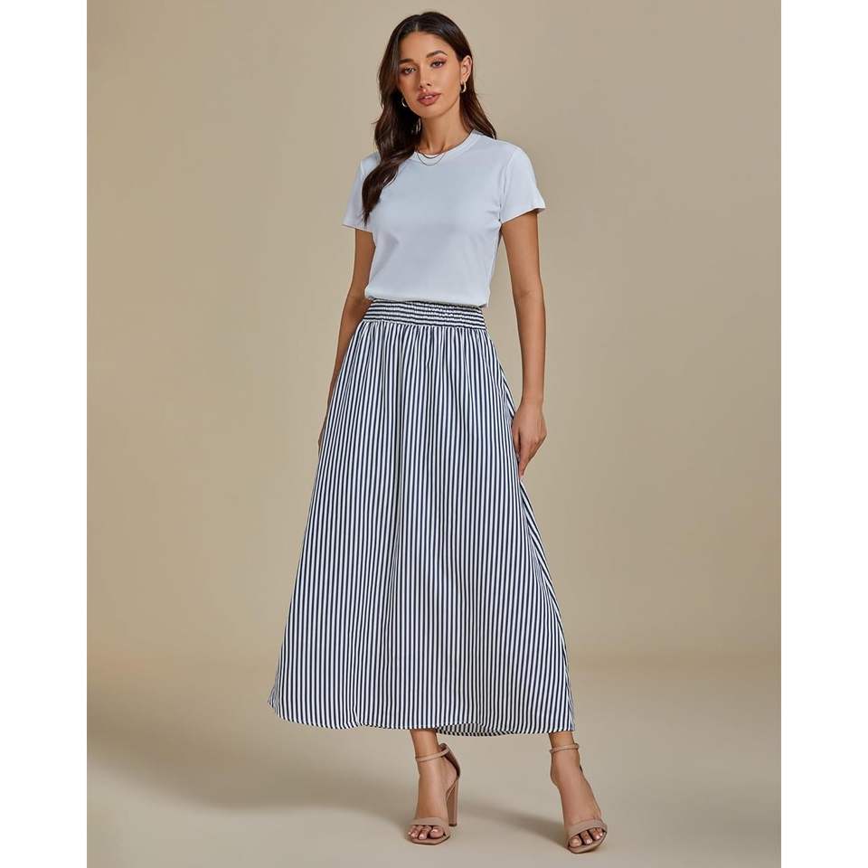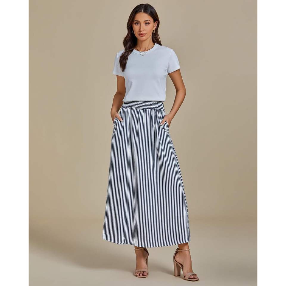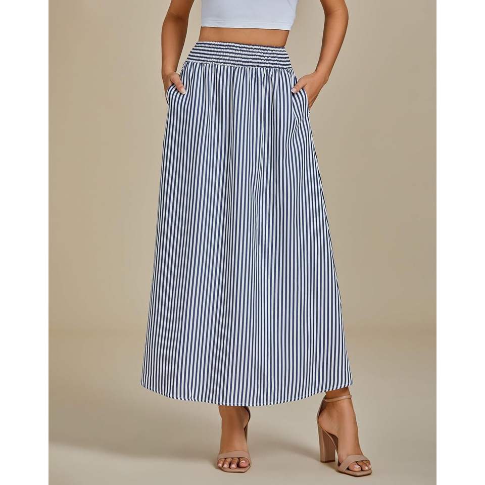 2025 Summer Beach Vacation Skirt for Women Maxi Long Flowy Striped with Leopard Pattern Trendy Smocked Elastic Waist Pockets
