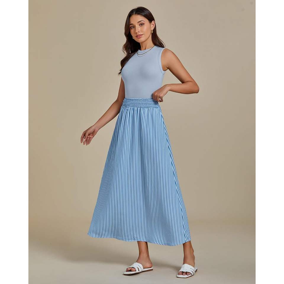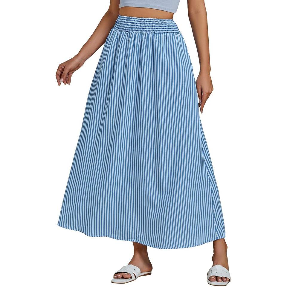 2025 Summer Beach Vacation Skirt for Women Maxi Long Flowy Striped Design Pockets Trendy Smocked Elastic Waist Made Leather