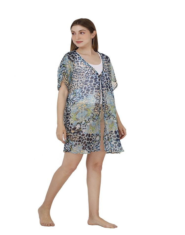 2025 Summer Casual Women Swimwear Beachwear Sexy Beach Caftan Kimono Animal Print Sheer Light Blue 1 Beach Dress Shrug Cover-Up