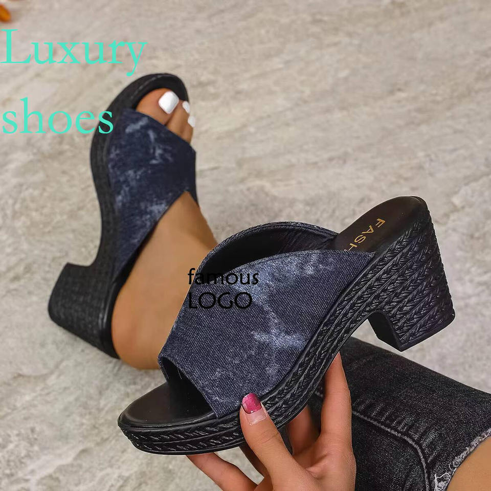 2025 Summer New Fashion Women's Plus Size Slippers Sandals Classic Denim Wedge Flat PU