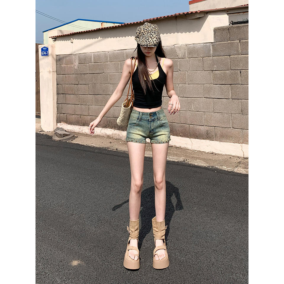 2025 Summer New Nostalgic Denim Shorts for Women American Rivet Mid Waist Elastic Tight Casual Hot Girl Outer Wear Hot Pants