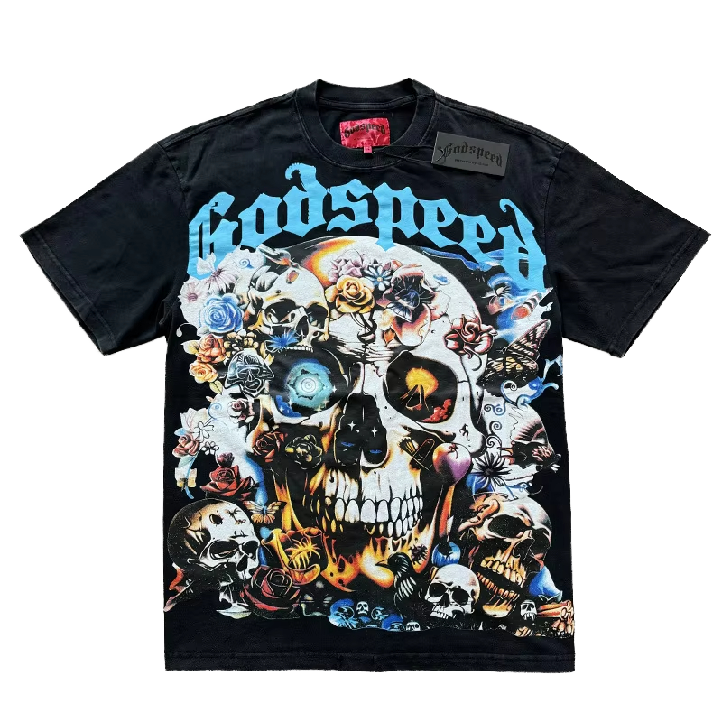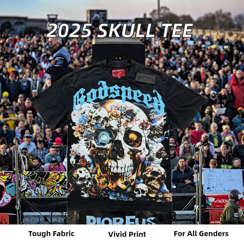 2025 Summer Unisex 260g Woven T-Shirt 100% Cotton Loose Short Sleeve New Trend Skull Rock Band Pattern Hip Hop Style