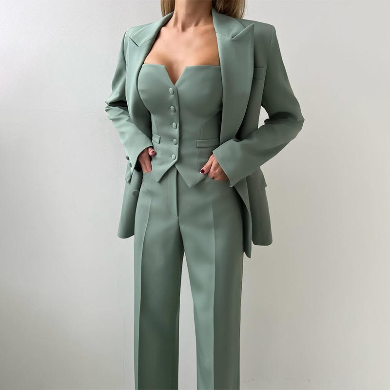 2025 Summer Vintage Print Women's Office Casual Three-Piece Suit Set Slimming Solid Color Top and Knee Length Bottoms Stylish