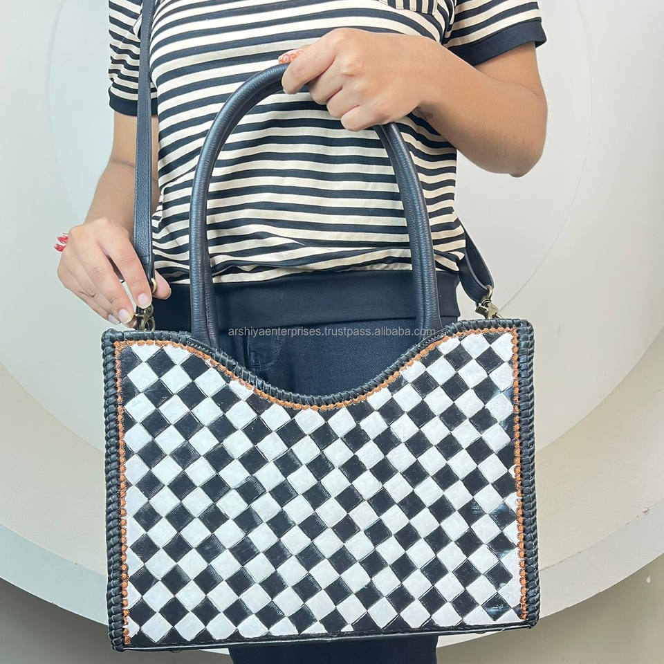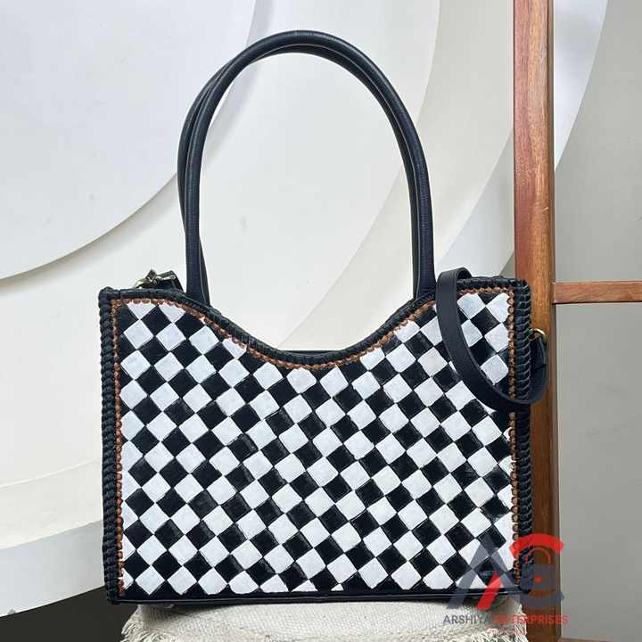 Product name:Hand Tooled Checkered Leather Crossbody Tote Bag
