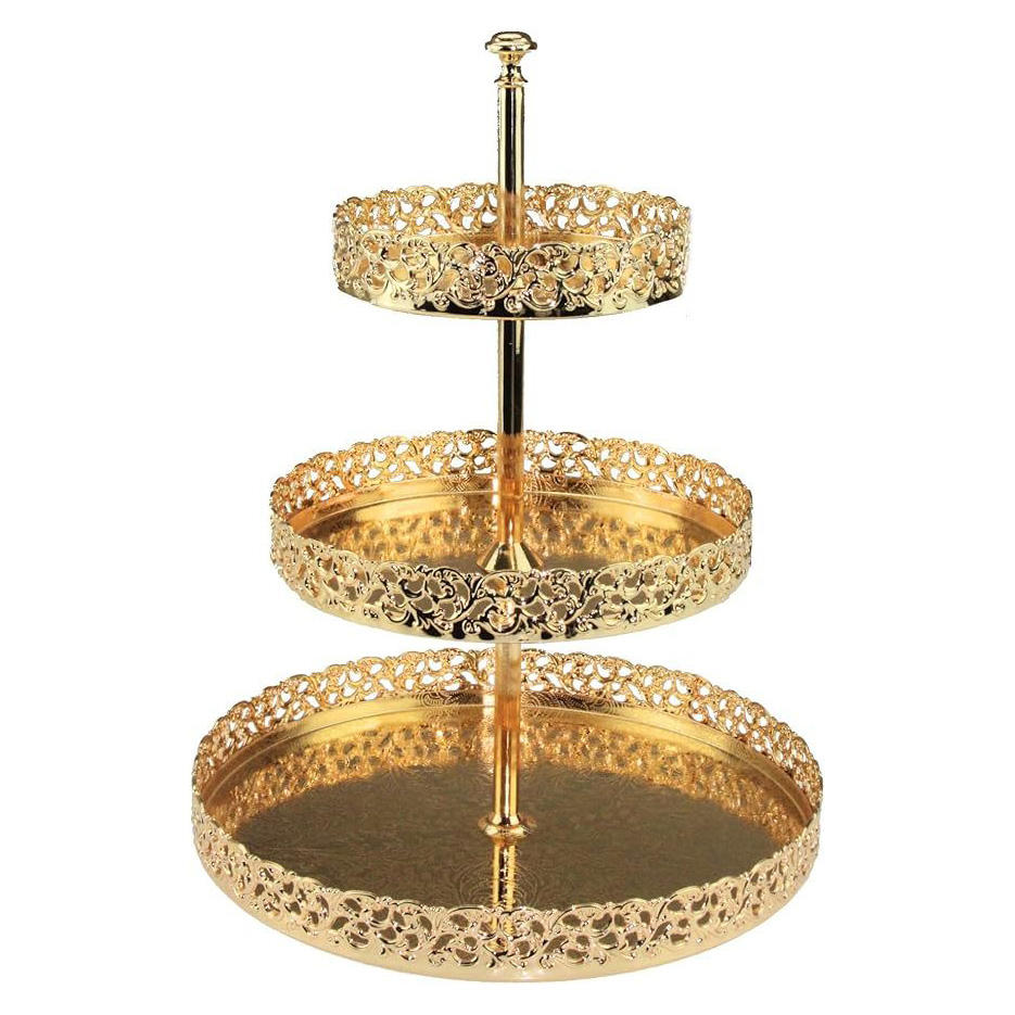 2025 Trending Design 3-Tier round Hammered Cake Stand with Gold Stainless Steel Eitching Tray Event Decorative Item