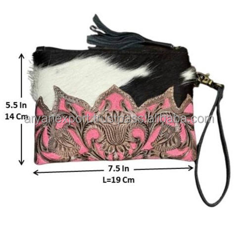 2025 Trending Product Newly Design Large Hand Tooled Leather Clutch Wristlet Bag for Women's Cowhide Tassel Zipper Purse Pouch