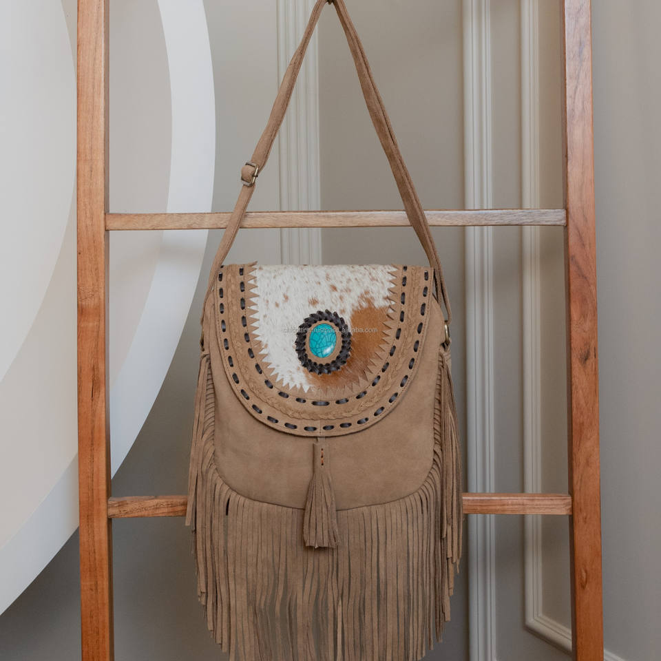 2025 Trendy Custom Luxury Cowhide Fringe Crossbody Bag for Women's High Quality Genuine Suede Leather Turquoise Stone Handbags
