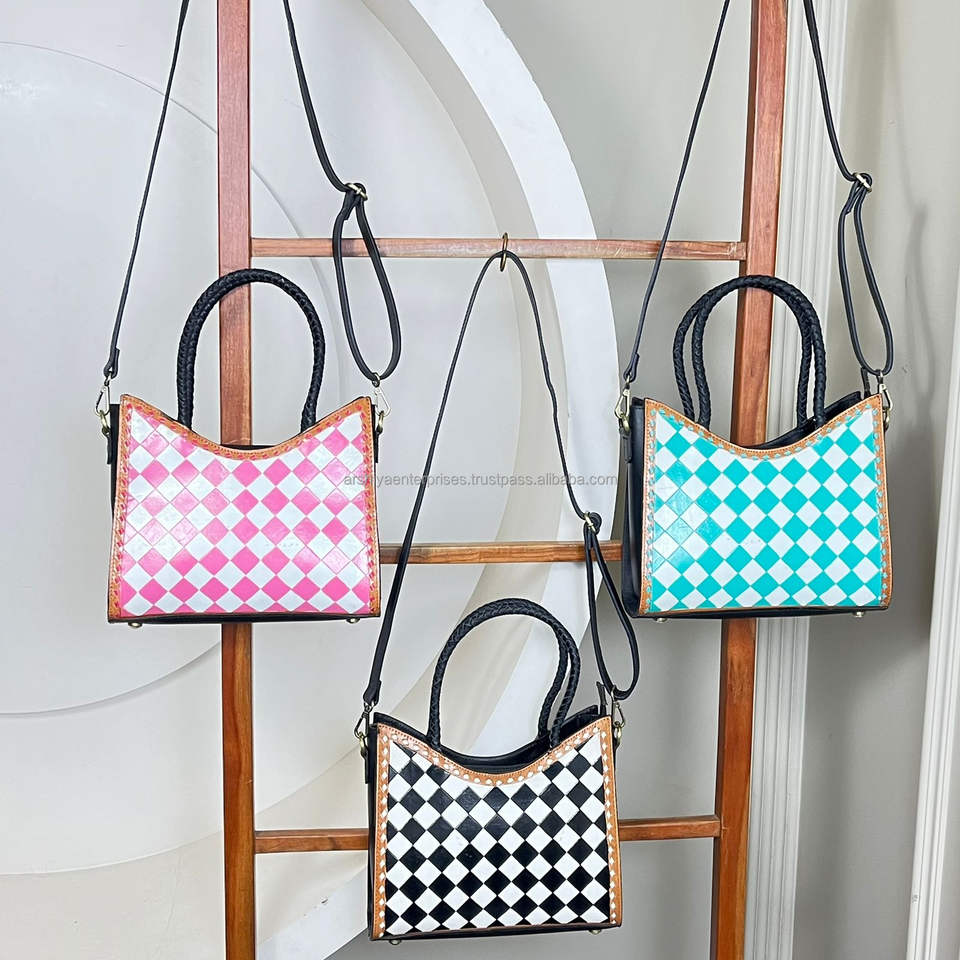 Product name:Hand Tooled Checkered Leather Tote Bag