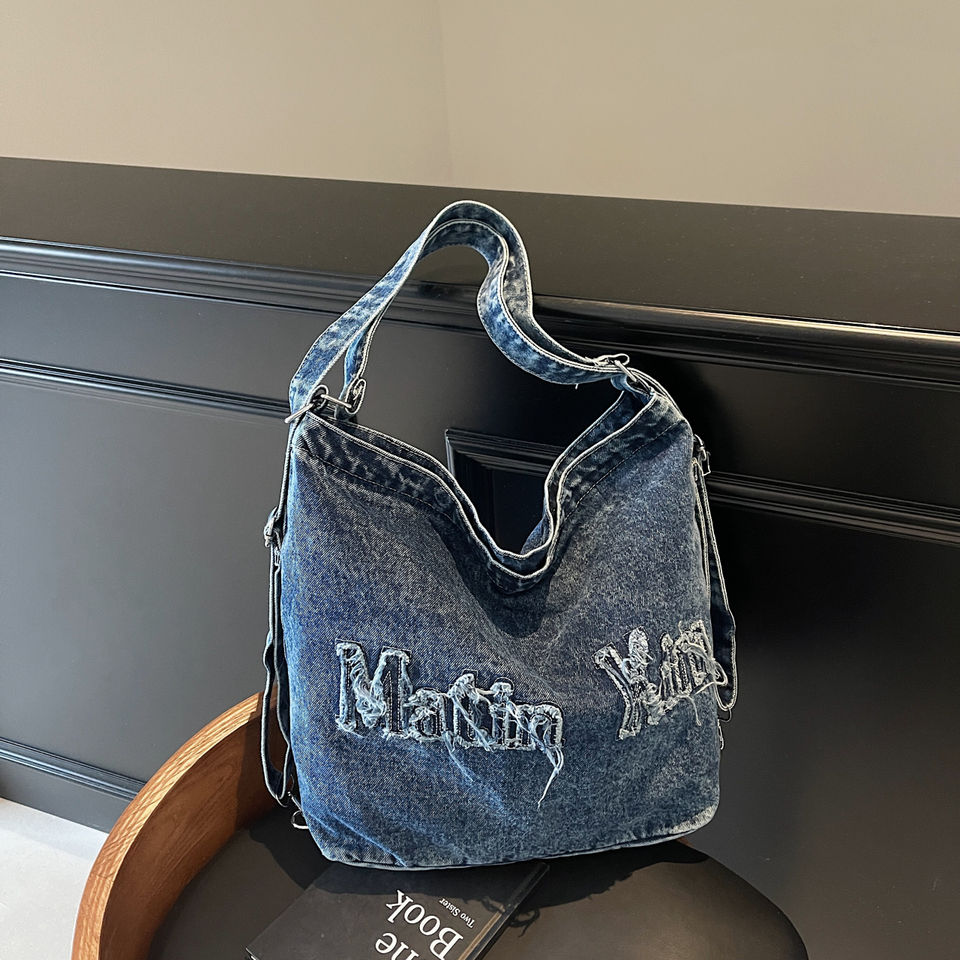 Keywords:2025 Vintage Raw Hem Washed Embroidered Letter Denim Tote Bag