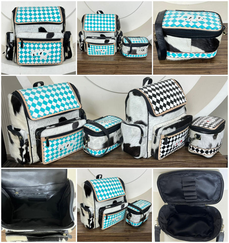 2025 Western Style Handcrafted Checkered Leather Diaper Backpack With Trendy Matching Cosmetic Bag Two Piece Set For Women's