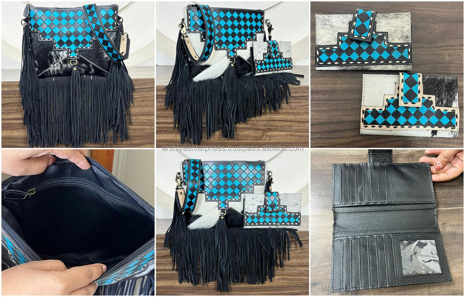 2025 Western Style High Demand Checkered Crossbody Fringe Bag And Hand Tooled Leather Bifold Wallet Matching Set For Women