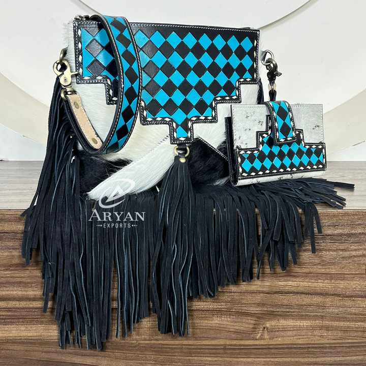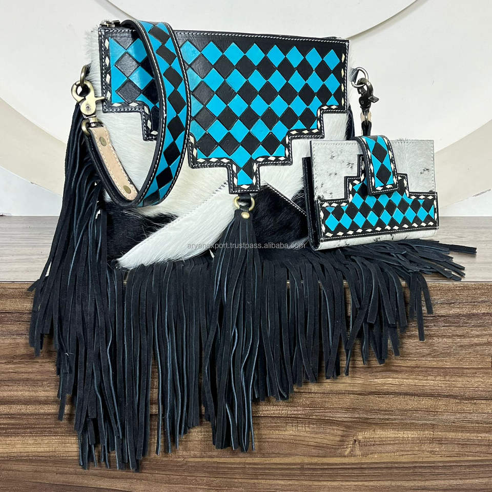 2025 Western Style High Demand Checkered Crossbody Fringe Bag And Hand Tooled Leather Bifold Wallet Matching Set For Women