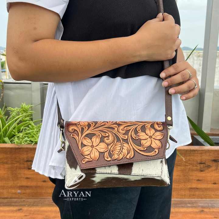 2025 Western Style Luxury Mini Crossbody Tooled Carving Leather Handbags Hair On Cowhide Leather Cute Women's Shoulder Bags