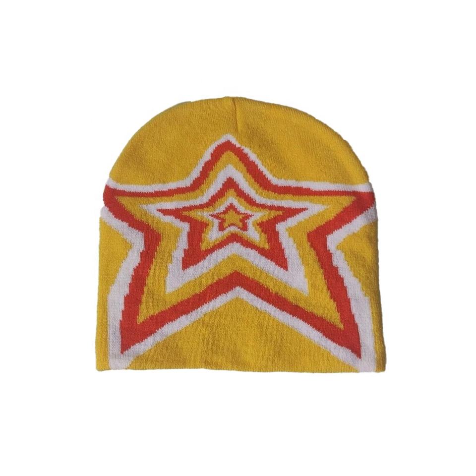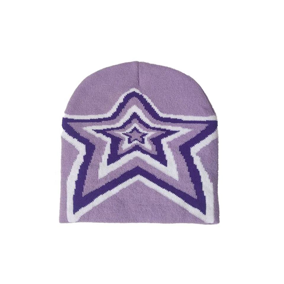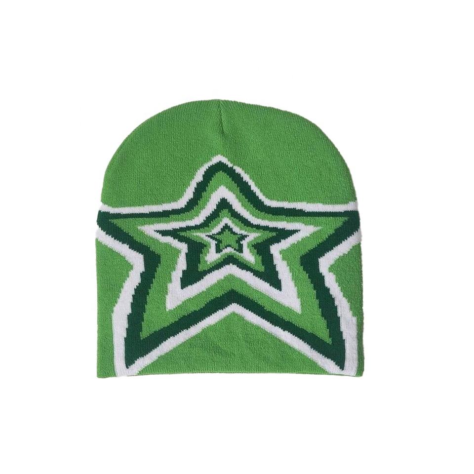 2025 Wholesale High Quality Jacquard Knit Cuff-less Beanies Hat for Men Custom Logo Acrylic Star Embroidery Winter Style Travel