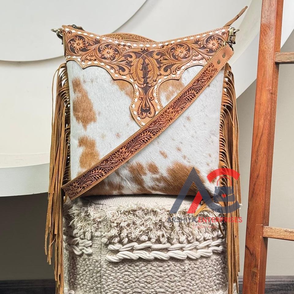 Hand Tooled Cowhide Leather Fringe Crossbody Bag