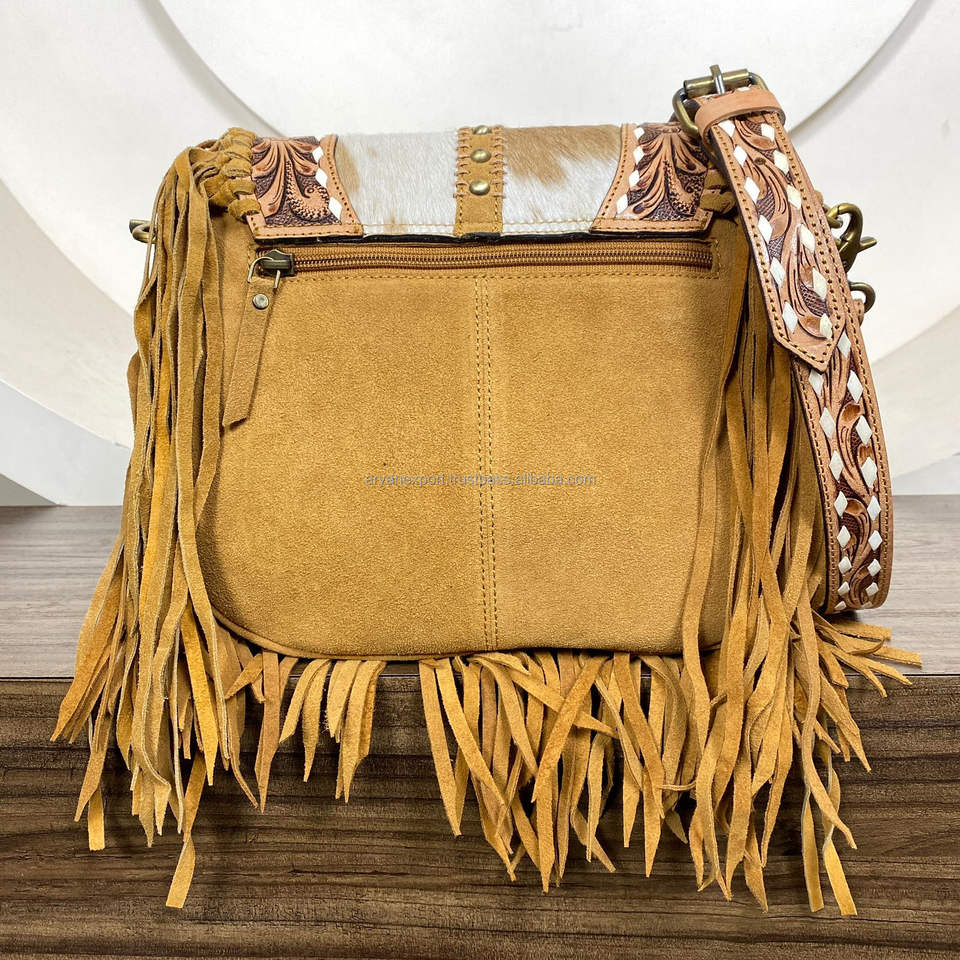 Hand Tooled Fringe Cowhide Leather Crossbody Messenger Bag