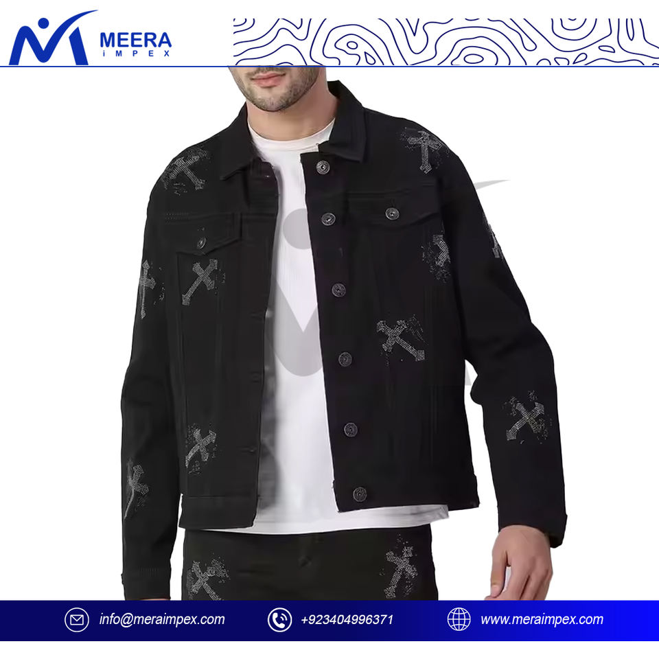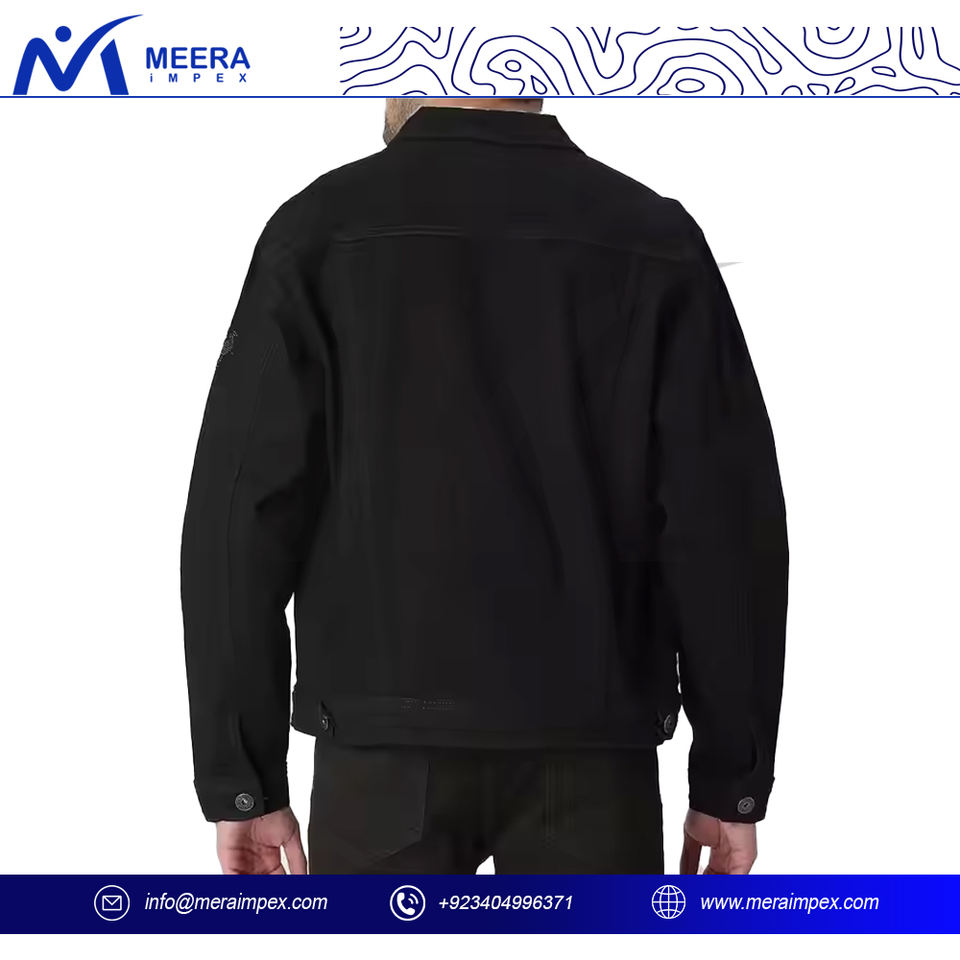 2025 Wholesale Solid Black Color Denim Jacket for Men Custom Printed Logo Button Style Stand Collar Slim Fit Men's Jeans Jacket