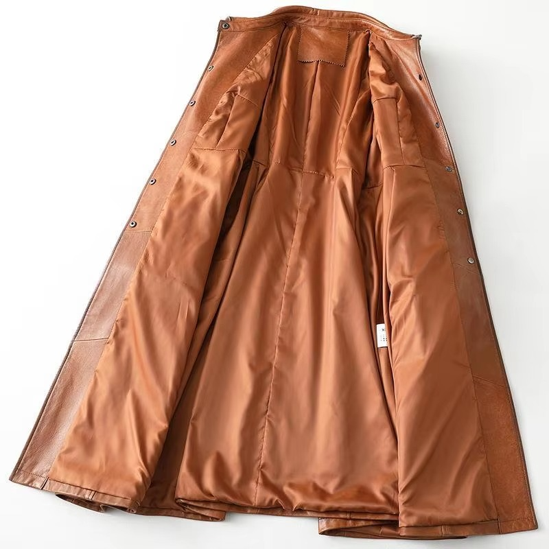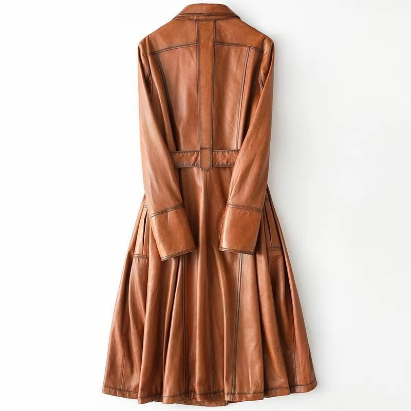 2025 Winter Trench Leather Coat for Women Long Slim Fitted Coat with Belt Closure Genuine Leather Casual Style Waterproof