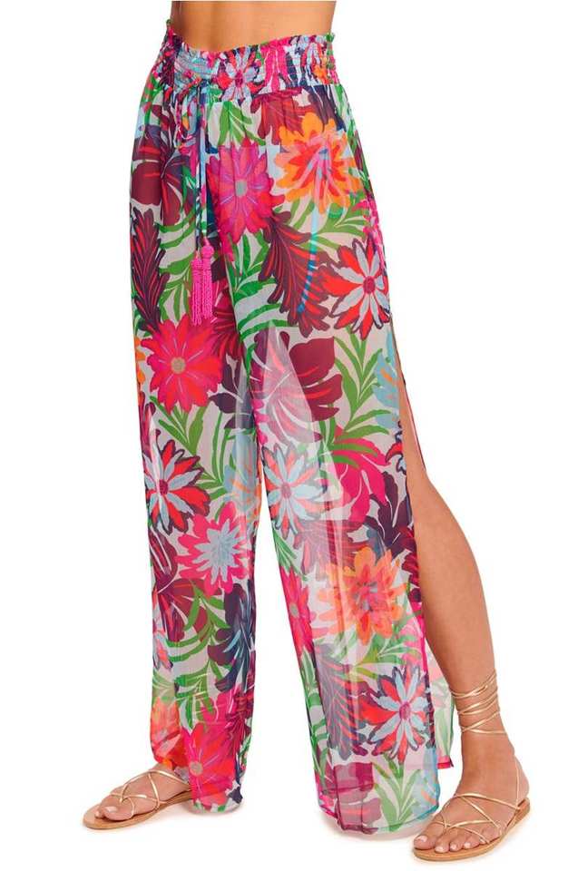 2025 Women Printed Chiffon Slit Pant Beachwear Elastic Floral Pattern Tassel Knotting Summer One-Piece Swimwear Cover-Up Mid