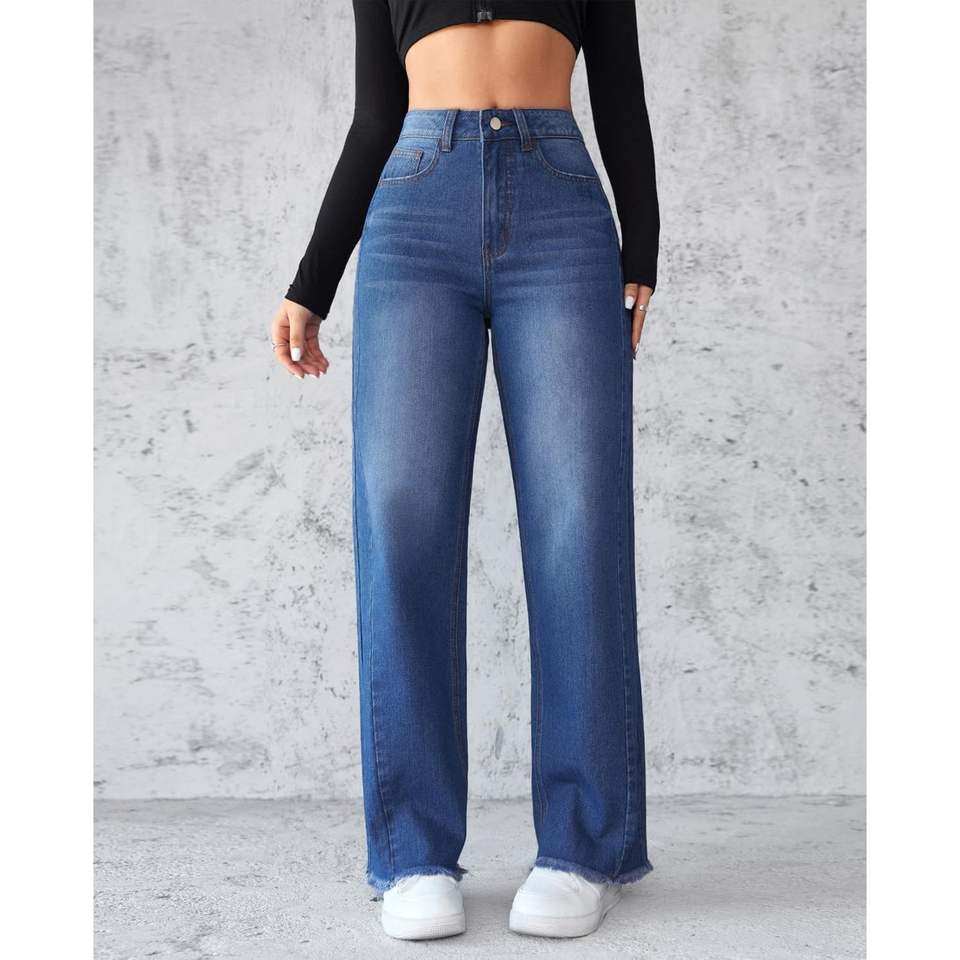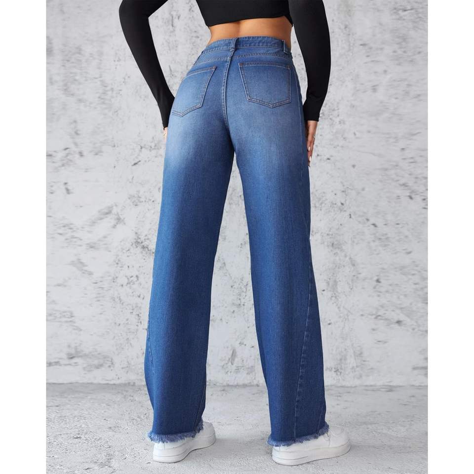 2025 Women's Baggy High-Waisted Straight Wide Leg Boyfriend Jeans Raw Hem Loose Long Denim Pants Flare Breathable Design