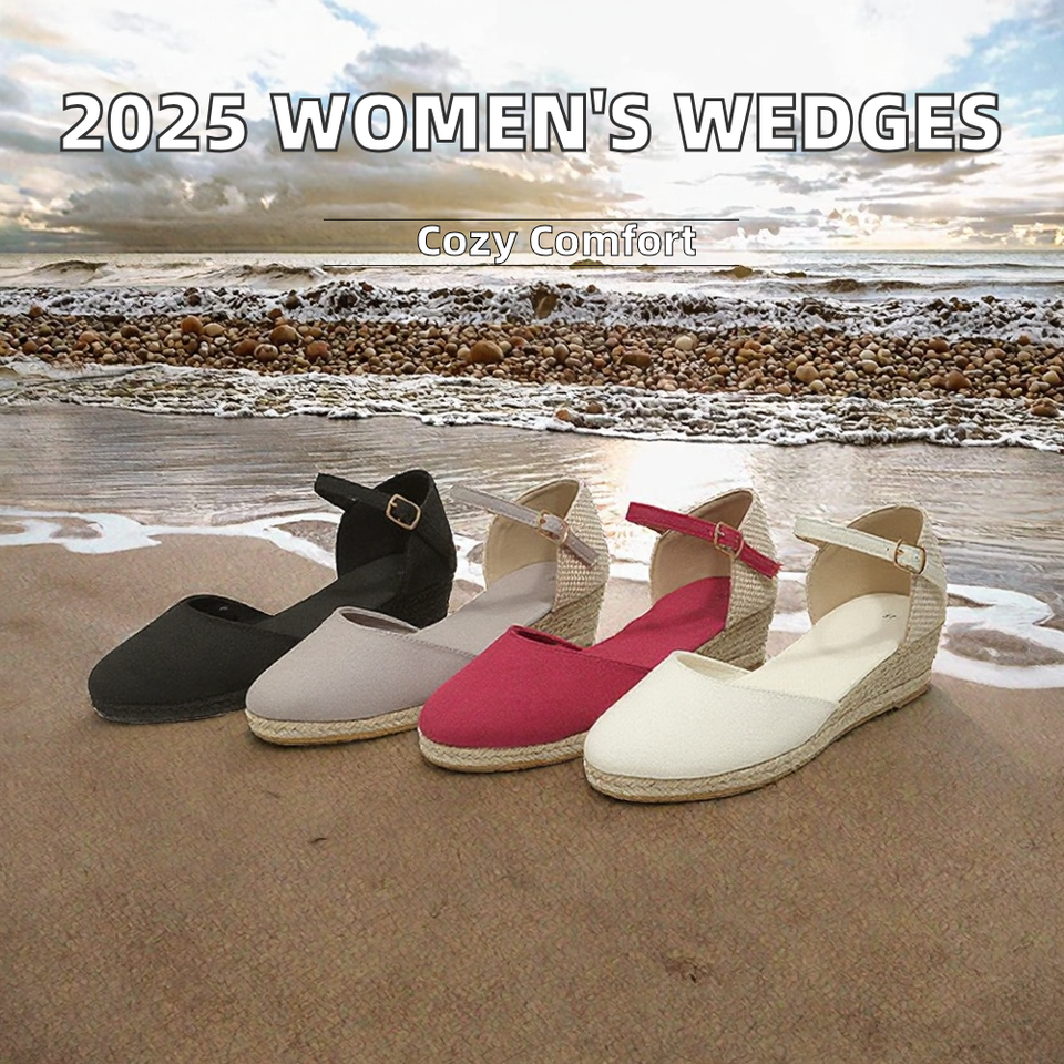 2025 Women's Casual Mid Heel Sandals Summer Wedges Thick Bottom Beach Strap Toe Cap Plus Size Soft PU Insole Upper Platform