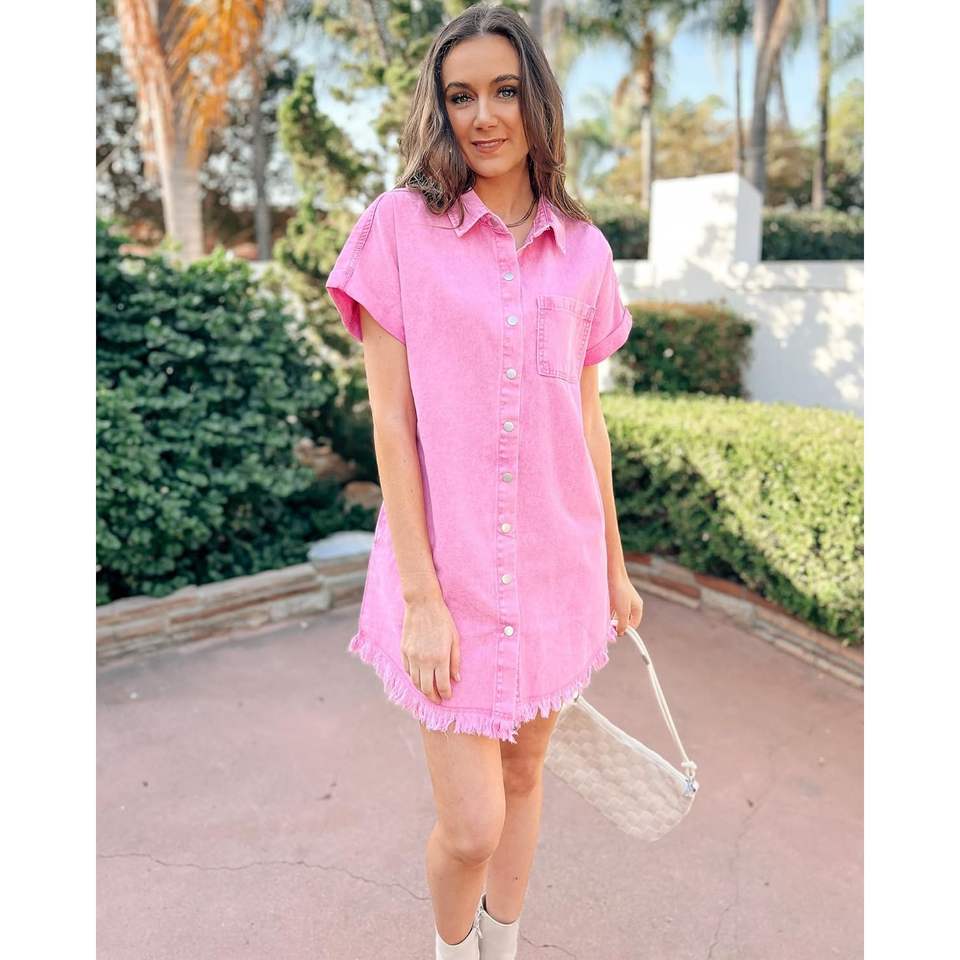 2025 Women's Casual Summer Midi Denim Dress Button Down Short Sleeves with Pockets Frayed Hem Y2K Style