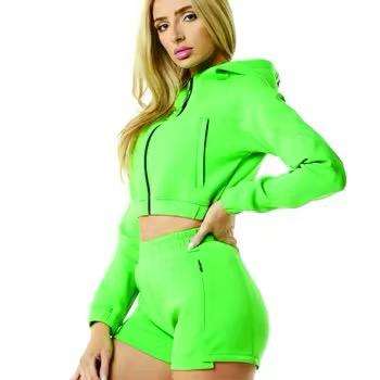2025 Women's Custom Logo Zip up Hooded Crop Top Casual Fleece Sweatshirt Sweat Shorts Set with Lace Decoration Solid Pattern