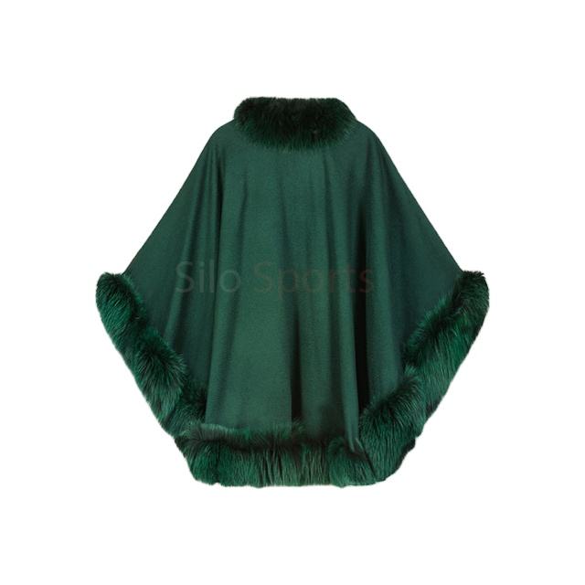 2025 Women's Emerald Cashmere Wool Cape Handmade with Fox Fur Trim Breathable Winter Heated Classic Capes Low MOQ OEM Available