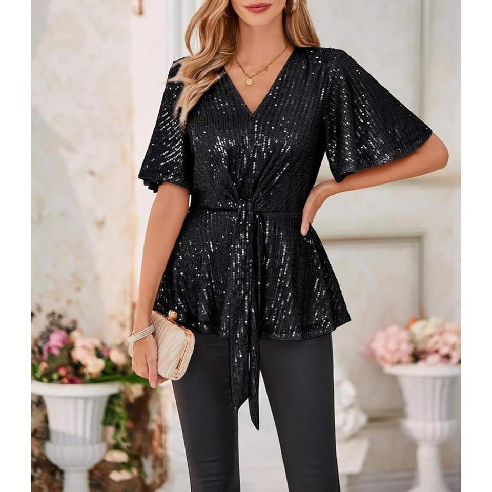 2025 Women's Glitter Blouse Sparkly Sequin Peplum V-Neck Top Tie Front Short Bell Sleeves Dressy Party Bamboo Raw Materials