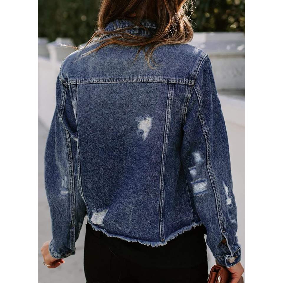 2025 Women's Gothic Casual Long Sleeve Denim Jacket Button Distressed Ripped Zimbaplatinum Jean Coat Diamond Print Washed
