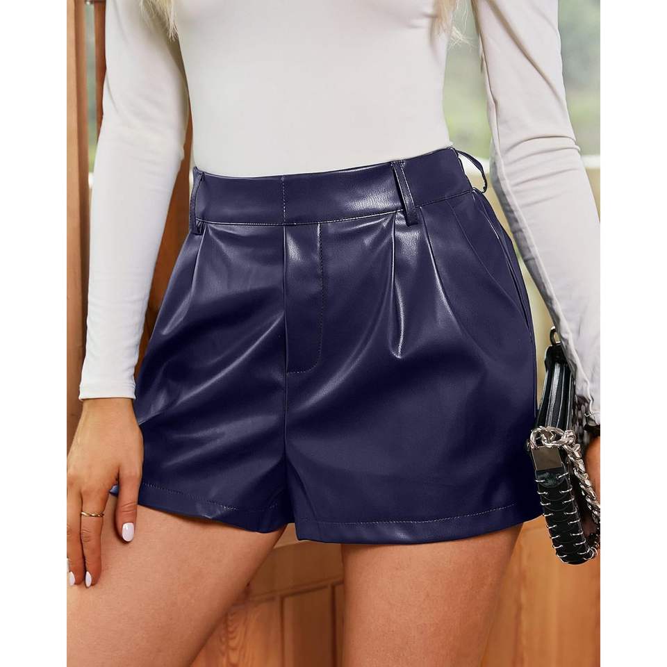 2025 Women's High Waisted XS Faux/PU Leather Pleated Wide Leg Stretchy Shorts with Pockets and Hot Pattern