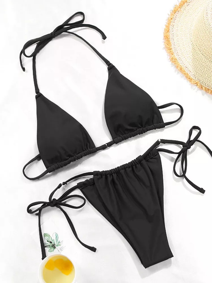 2025 Women's Sexy Solid Bikini Set Triangle Cup Bandage Halter Thong Adjustable String Swimwear Beachwear 2 Piece Set