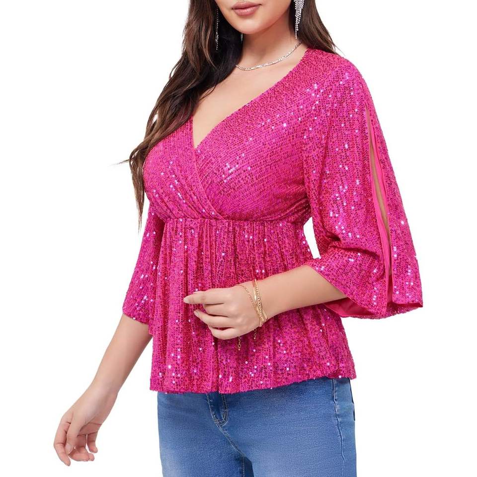 2025 Women's Sparkly Sequin V-Neck Wrap Peplum Top 3/4 Sleeve Split for Party Club Night Out Disco Cocktail