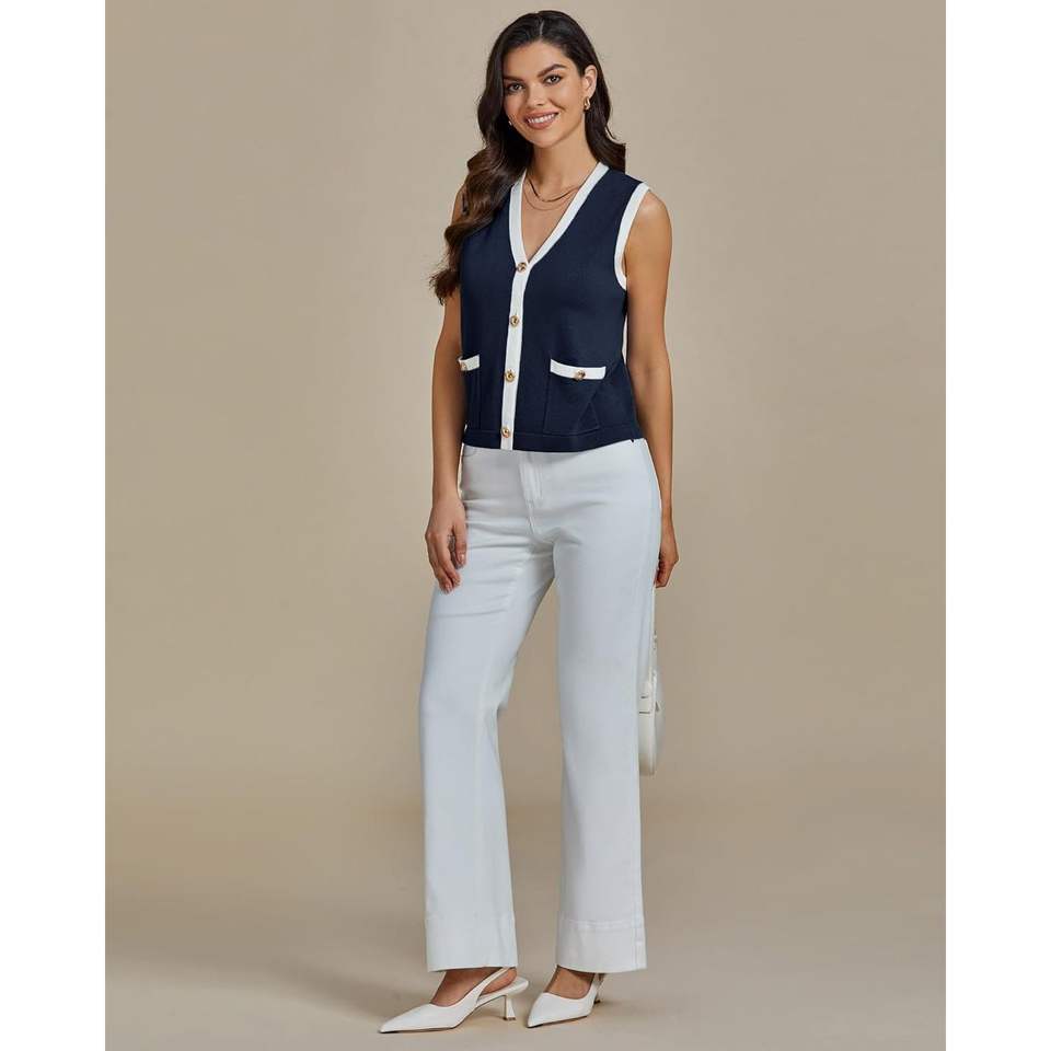 2025 Women's Trendy Colorblock Button Down Dressy Casual Sleeveless Summer Sweater Vest with Pockets for Spring Season
