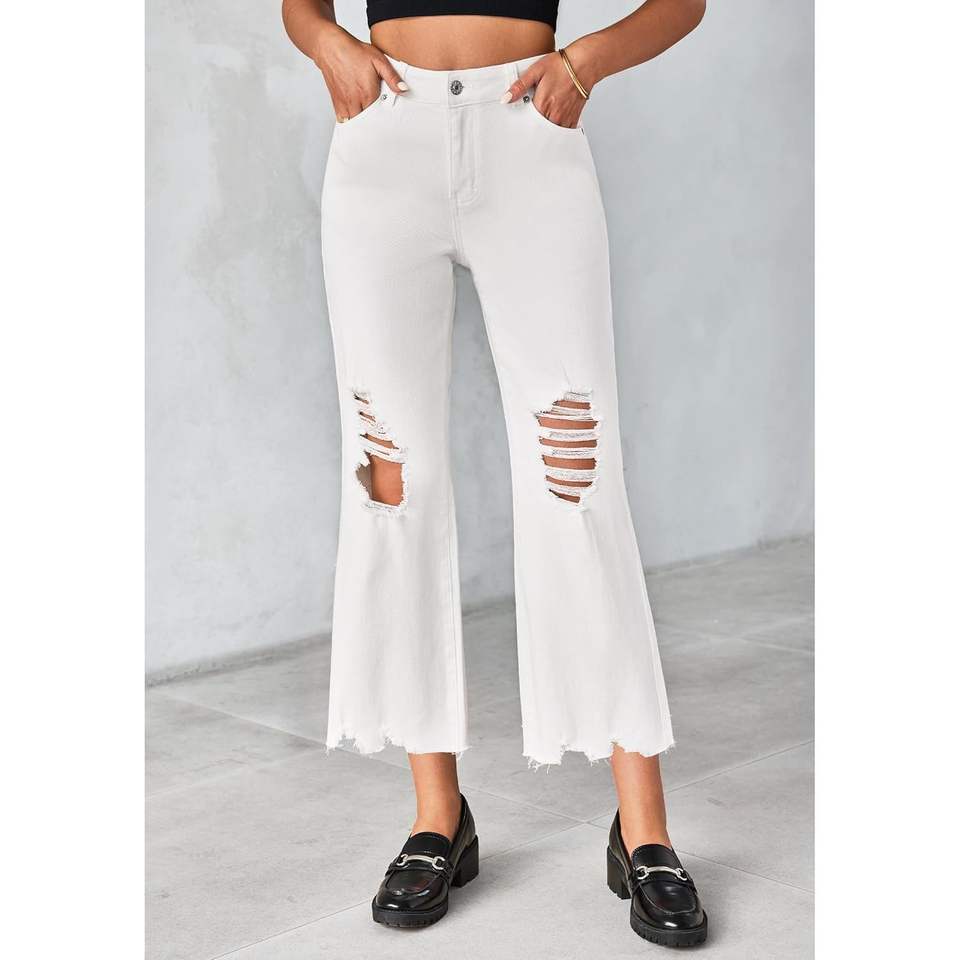 2025 Women's Trendy High Waisted Cropped Jeans Stretchy Wide Leg Flare Denim Pants with Distressed Raw Hem Breathable Design