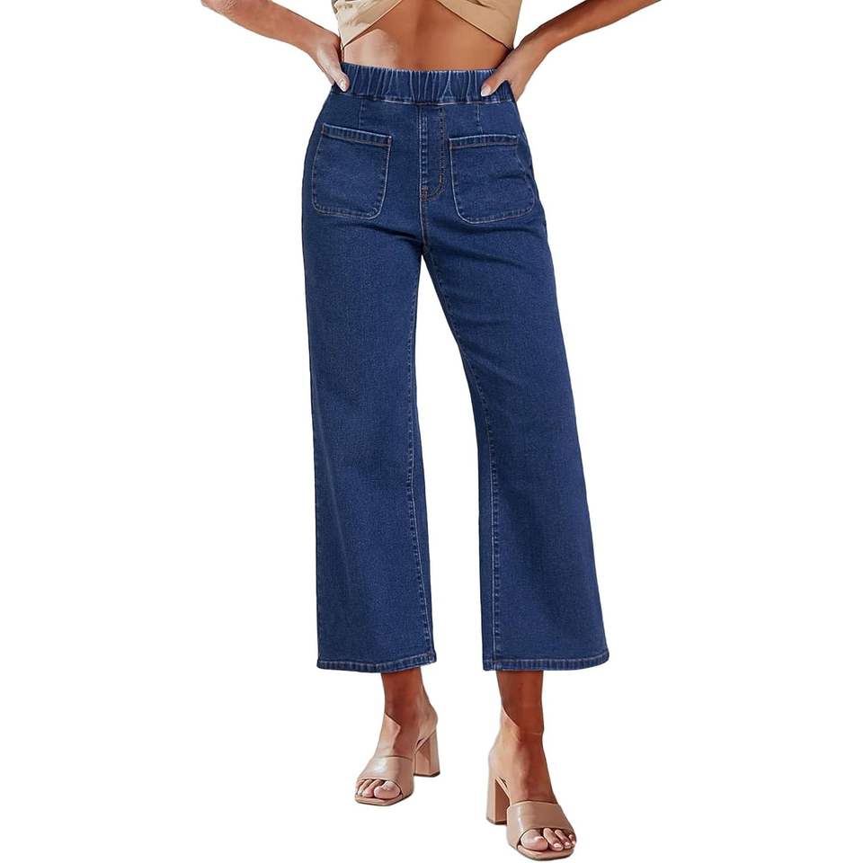 2025 Women's Trendy High Waisted Cropped Jeans Wide Leg Denim Pants Pull-On Stretchy Baggy Patch Pockets Breathable Design