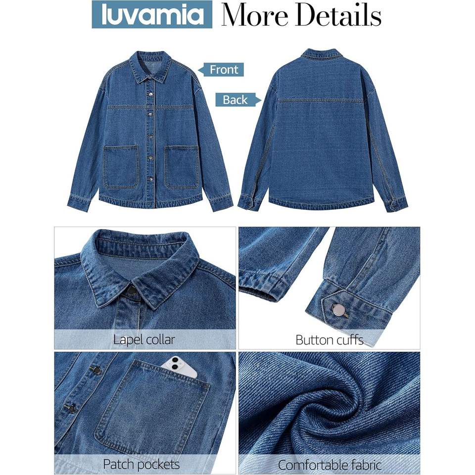 2025 Women's Trendy Oversized Long Sleeve Denim Jacket Casual Button Down Shacket with Patch Pockets
