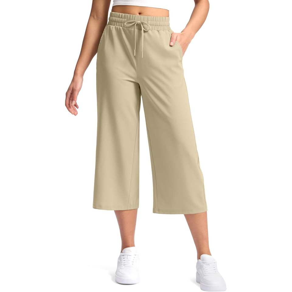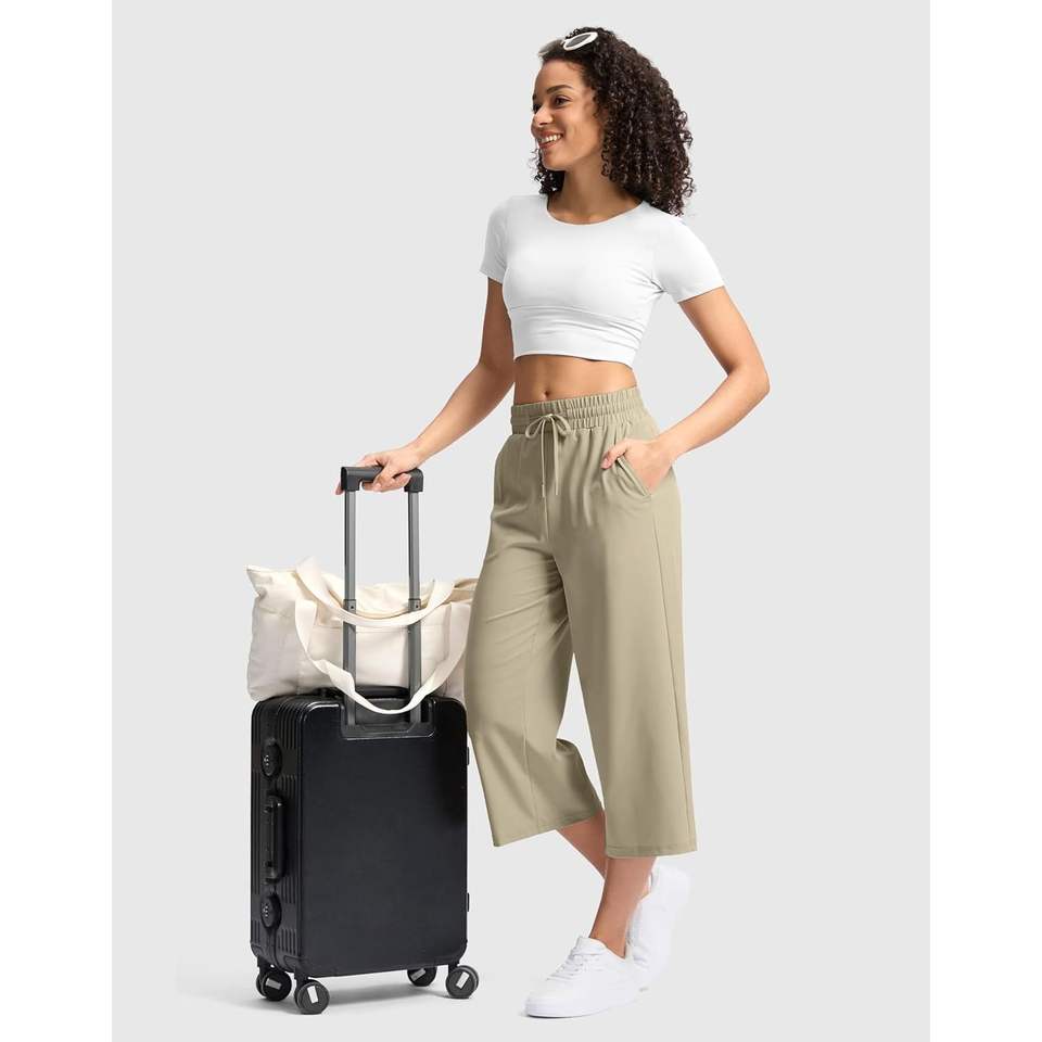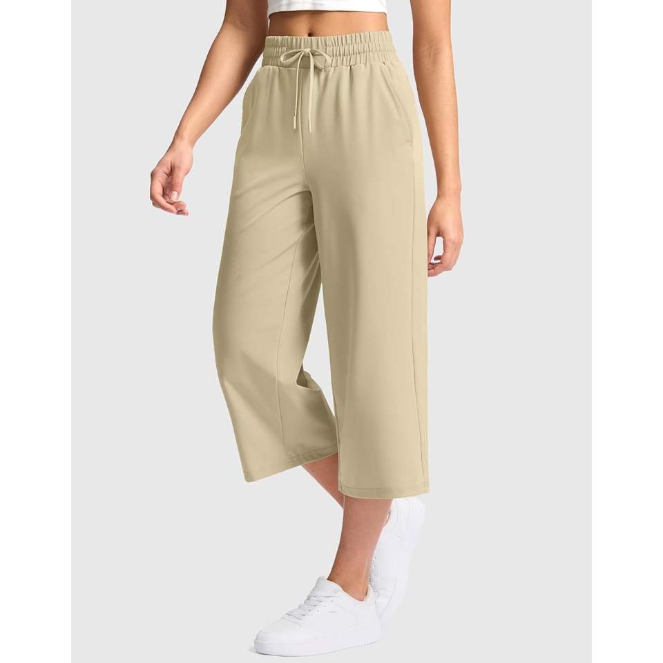 2025 Women's XXL Khaki Capri Pants Loose High Waisted Wide Leg Lightweight Casual Summer Travel Hiking Pants with Pocket