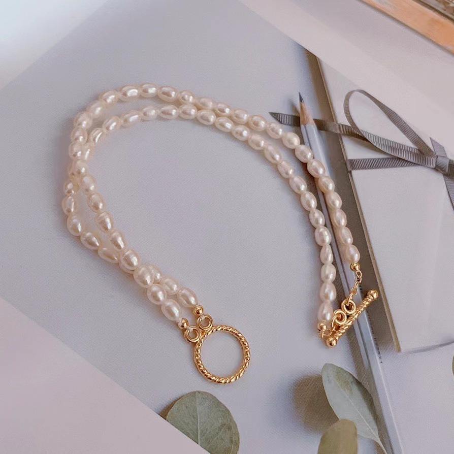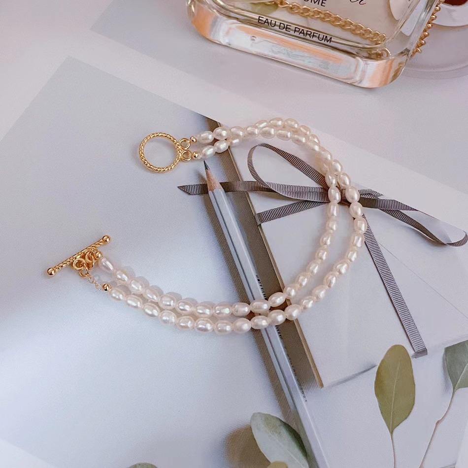 2025 Zhuji Women's Classic 14K Gold OT Buckle Stacked Bracelet 3-4mm 3-Layer Freshwater Rice & Pearl Simple Design